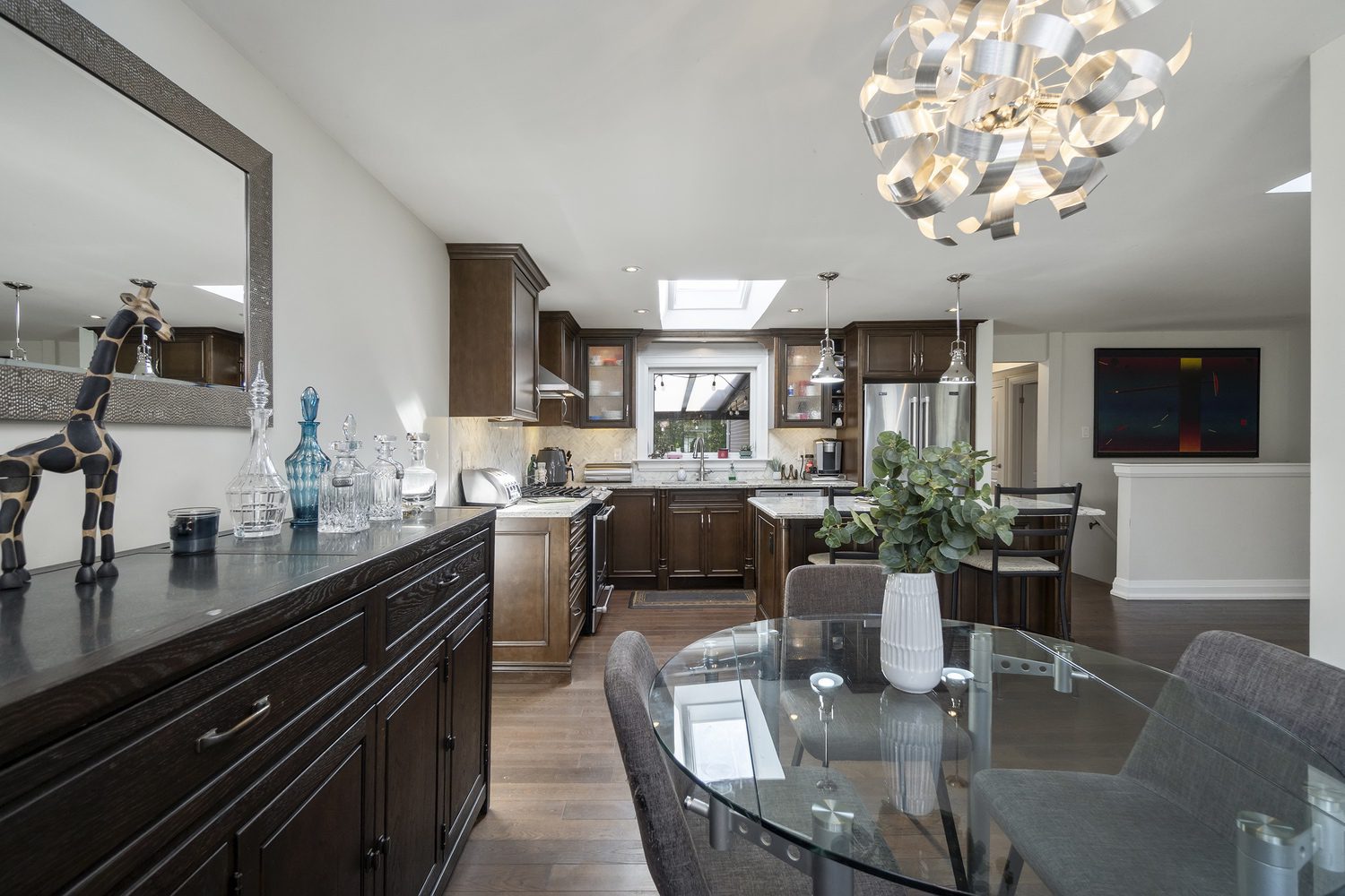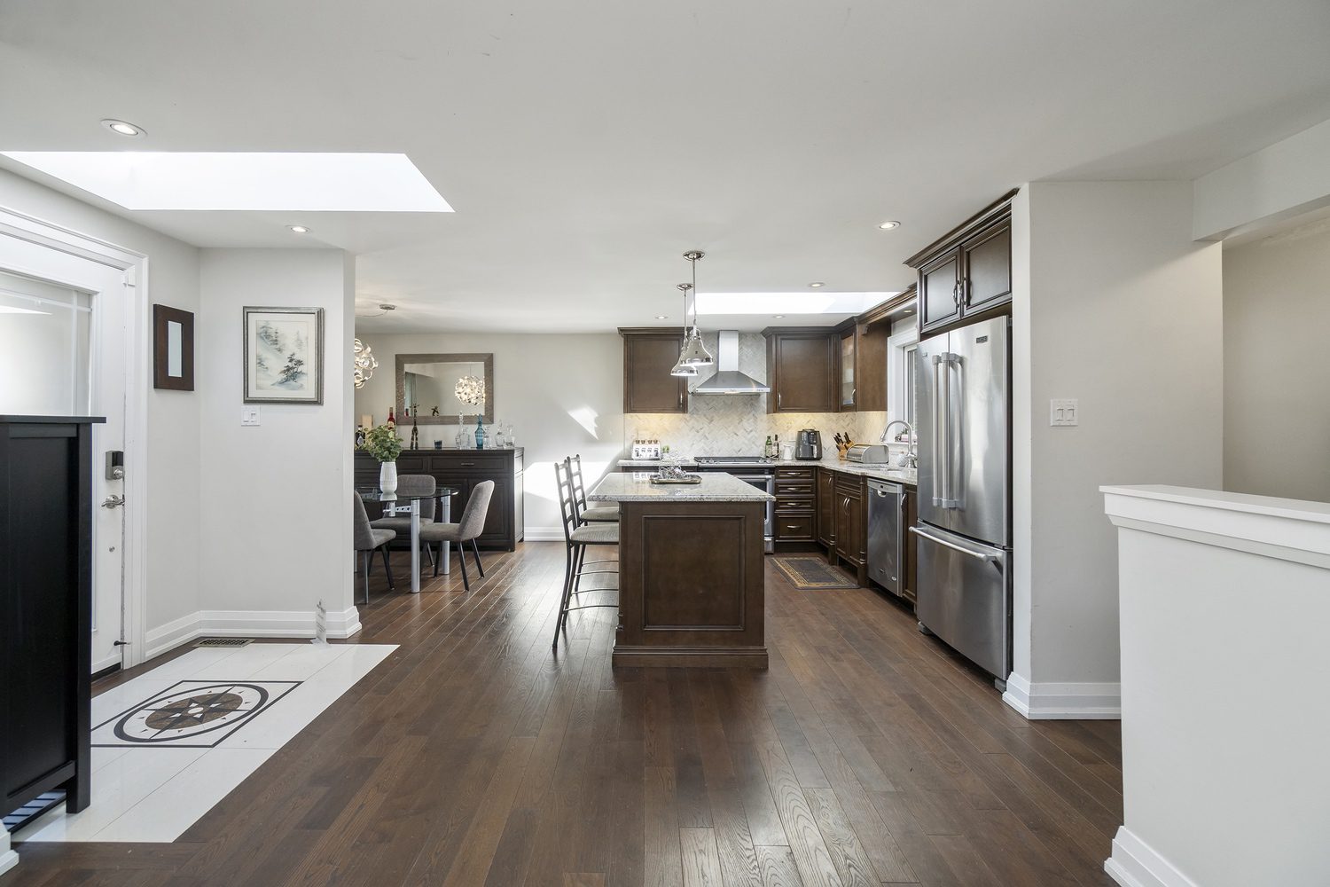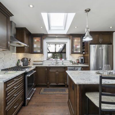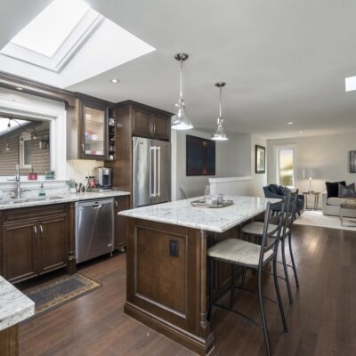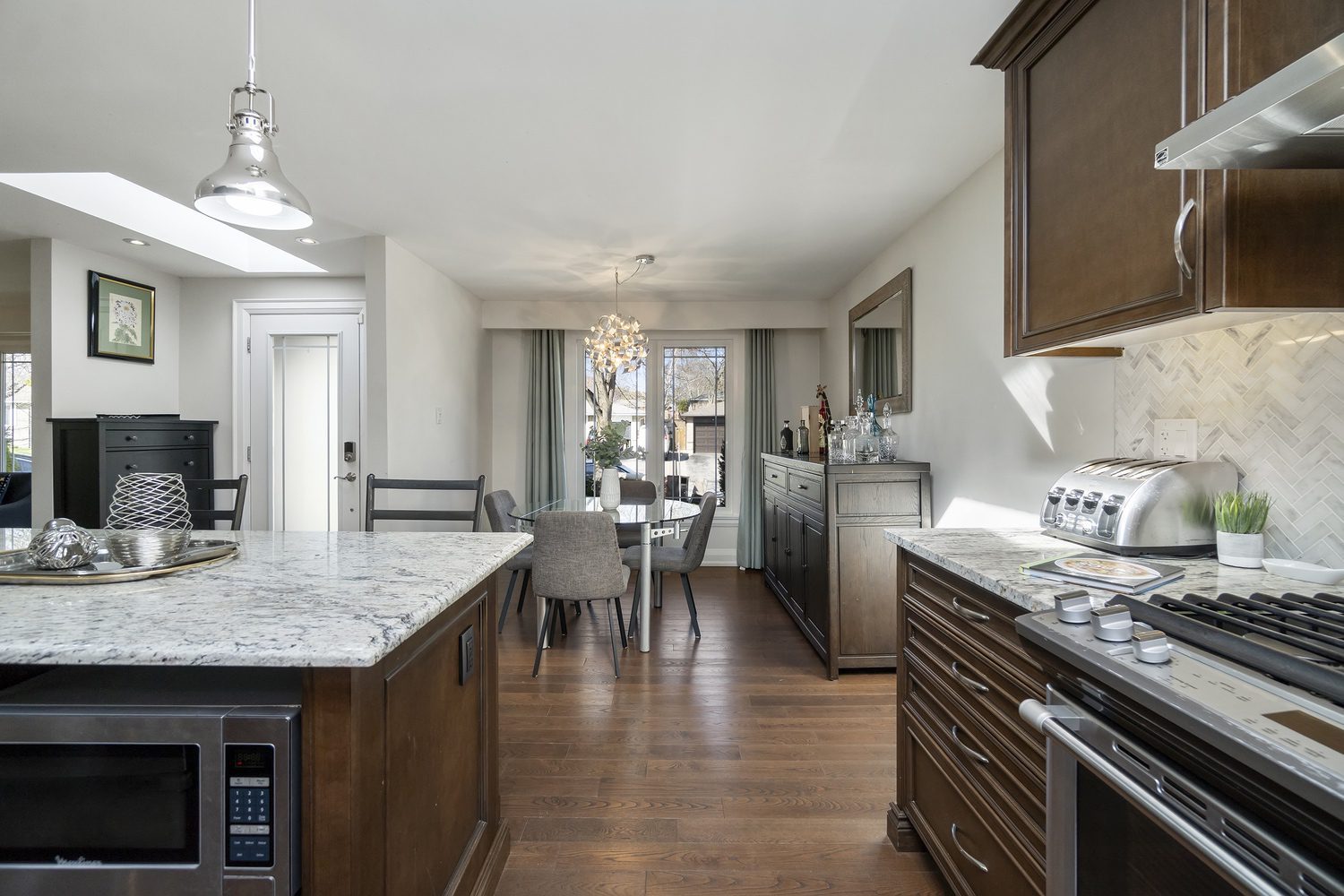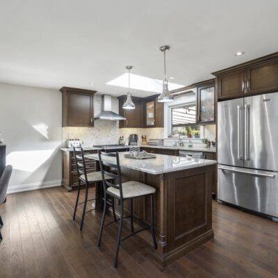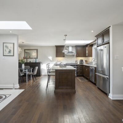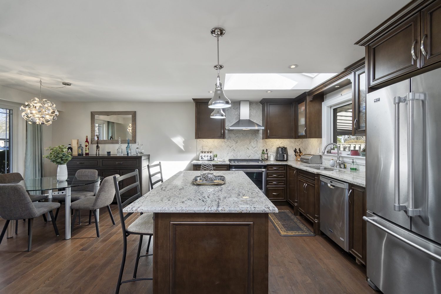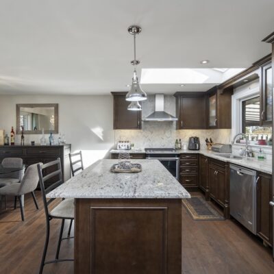 Step inside and you’ll immediately be impressed. The stunning, renovated main level features wide-plank hardwood floors and a bright, open-concept layout that seamlessly connects the living, dining, and kitchen spaces. A skylight fills the chef’s kitchen with natural light, highlighting granite countertops, a spacious centre island, and stainless steel appliances.