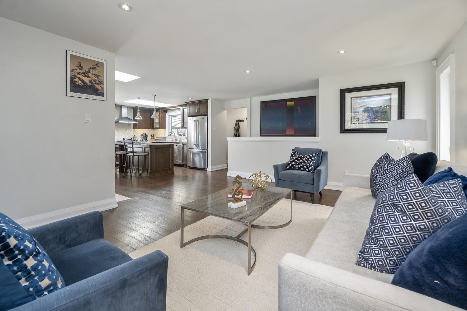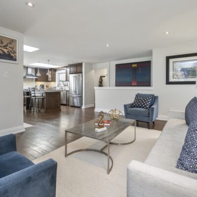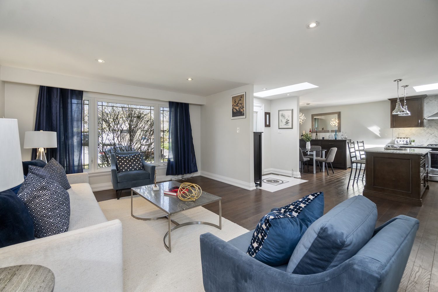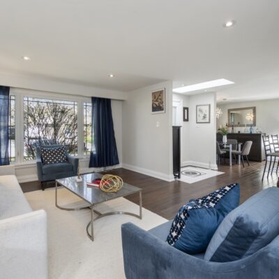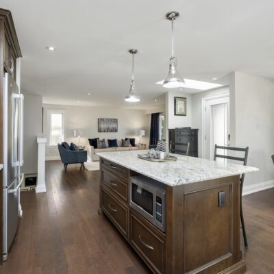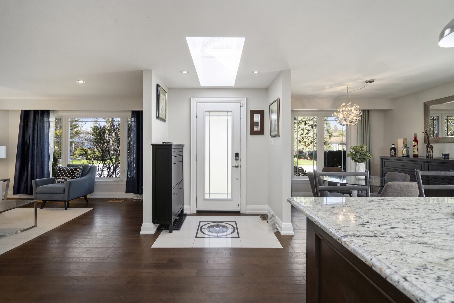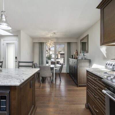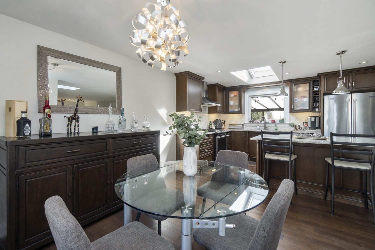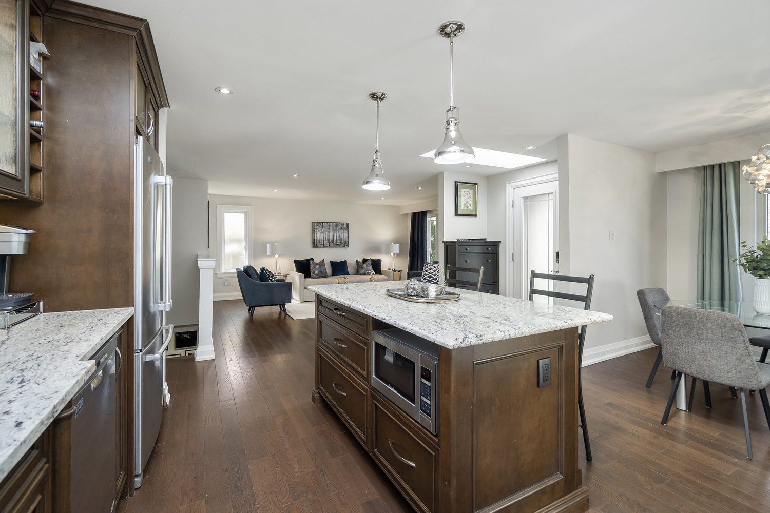 Step inside and you’ll immediately be impressed. The stunning, renovated main level features wide-plank hardwood floors and a bright, open-concept layout that seamlessly connects the living, dining, and kitchen spaces. A skylight fills the chef’s kitchen with natural light, highlighting granite countertops, a spacious centre island, and stainless steel appliances.