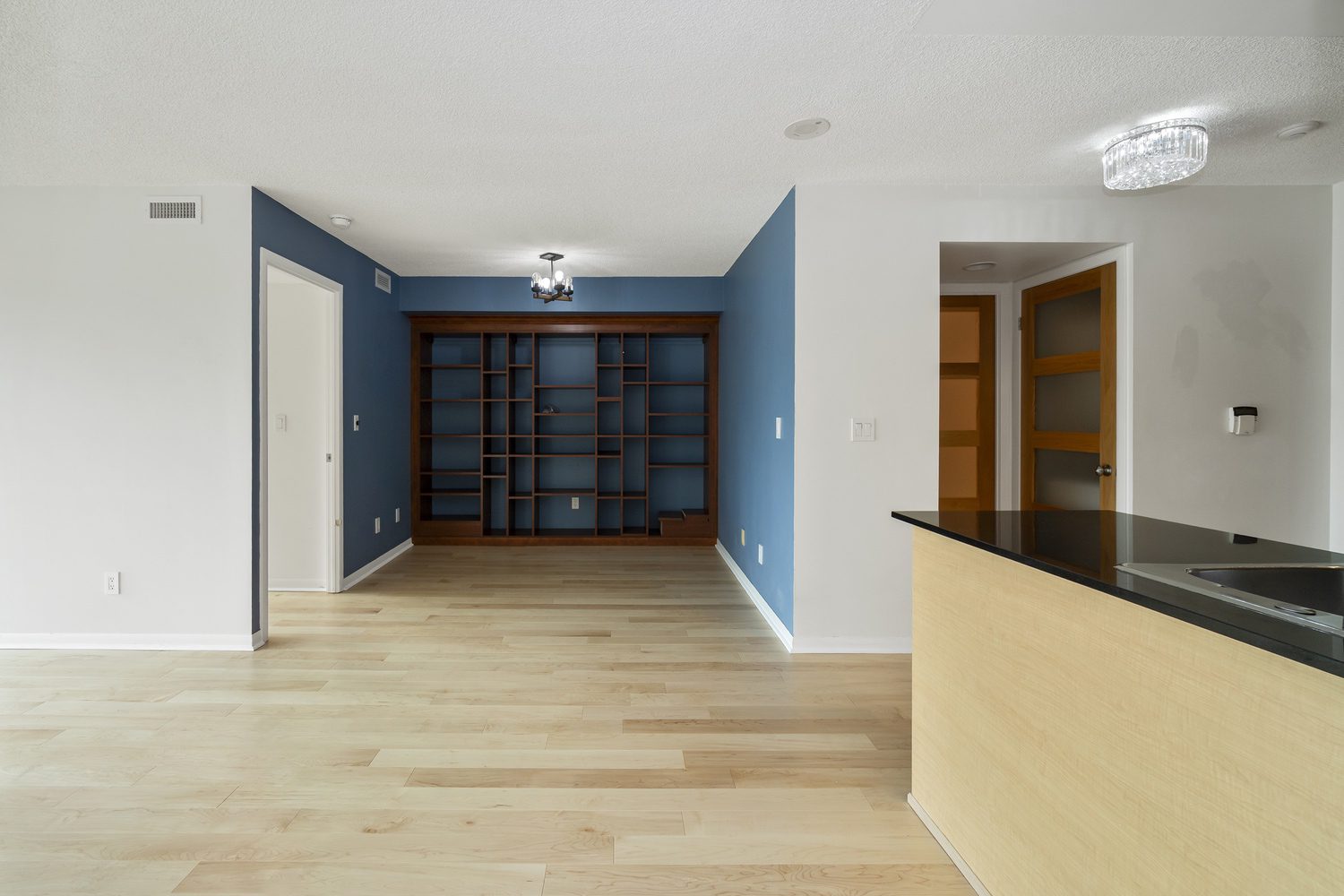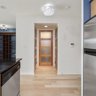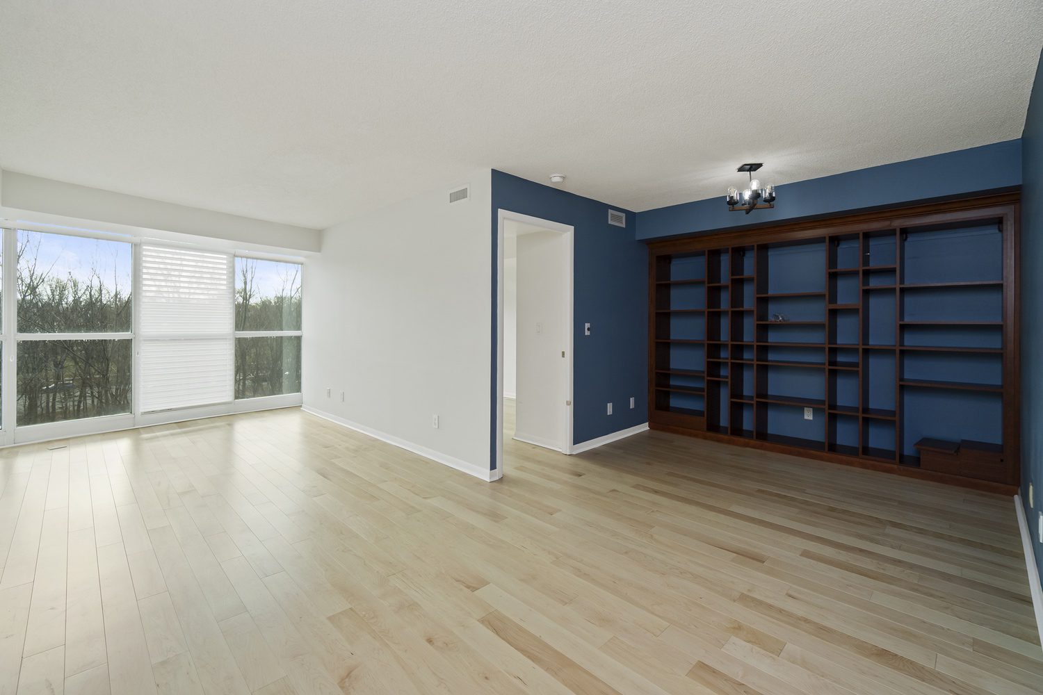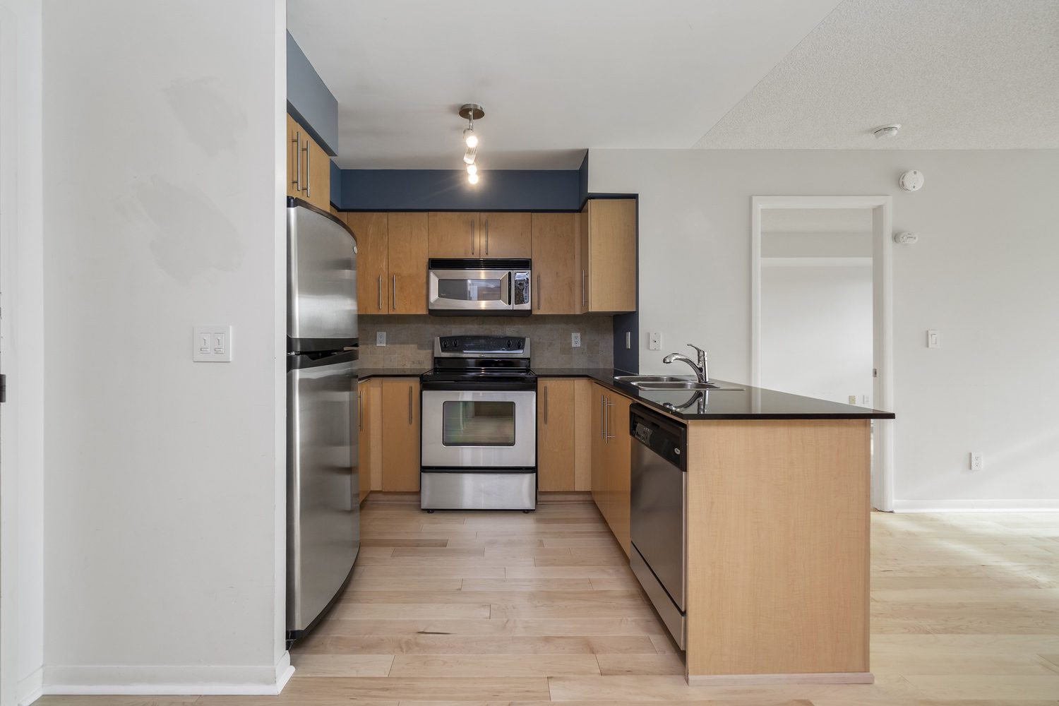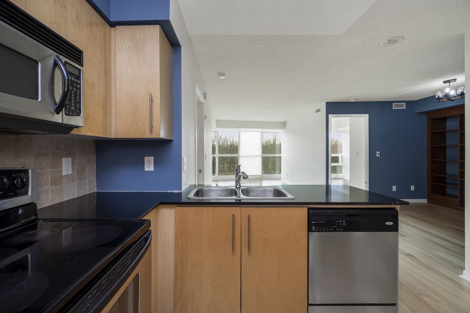 The modern kitchen is equipped with full-size stainless steel appliances, while in-suite laundry and a convenient entryway closet add everyday functionality. The generously sized second bedroom includes floor-to-ceiling windows and a dedicated closet, and the den offers the ideal setup for a home office or study.