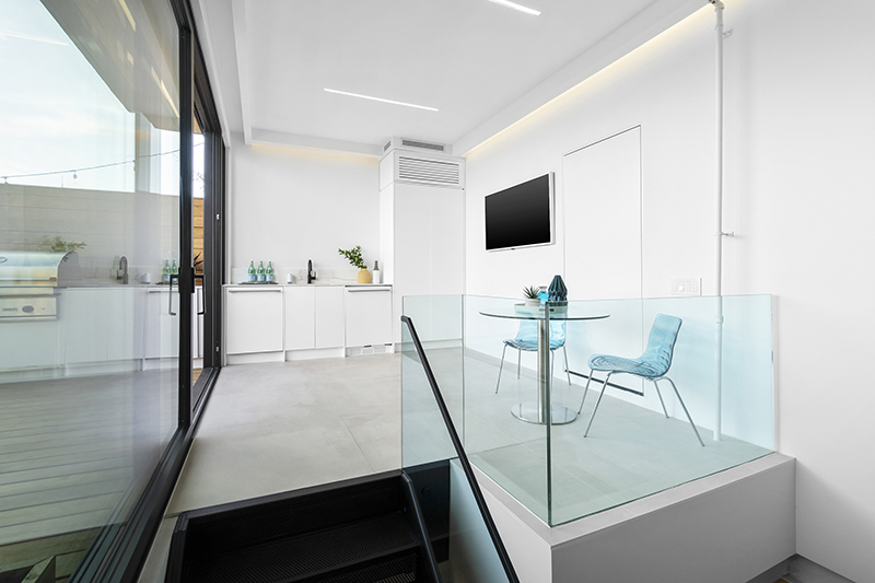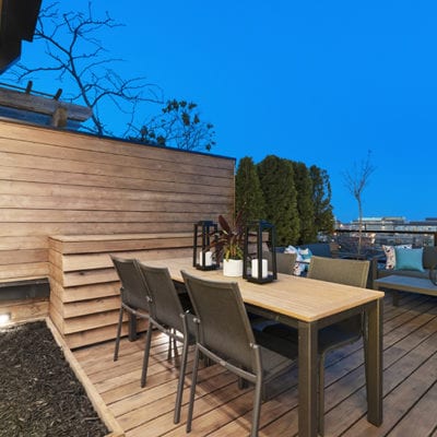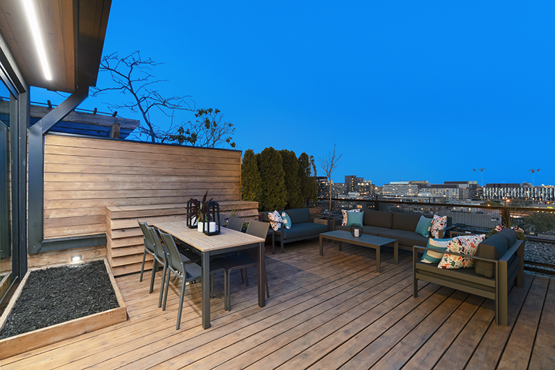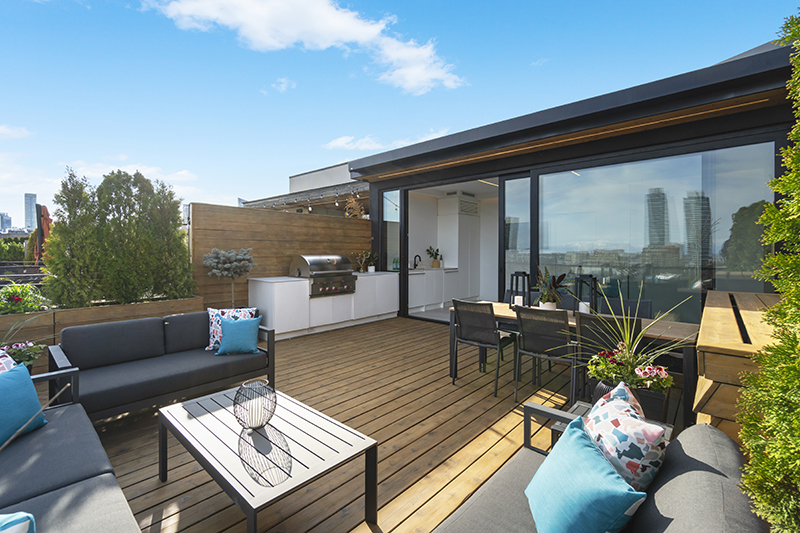 Luxurious private terrace with indoor-outdoor area that transforms your patio into extendable living room for all season. Heated floors, custom outdoor kitchen, cedar screw-less deck, retractable awning, gas fireplace and beautiful unobstructed views.